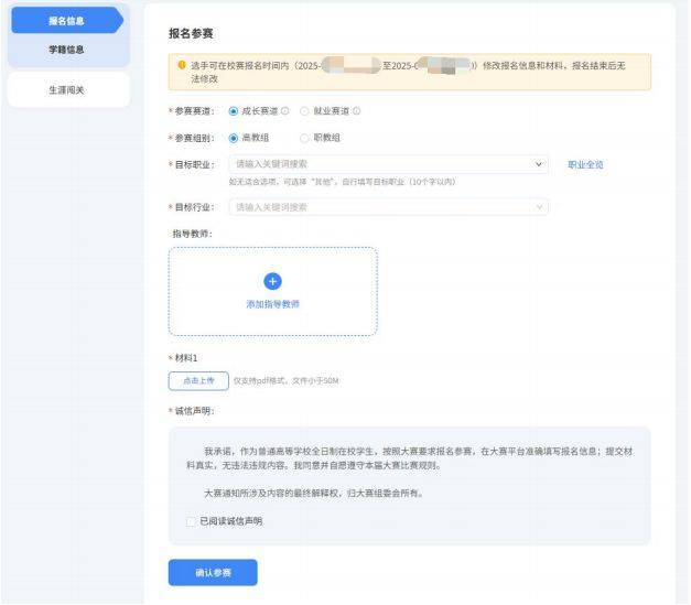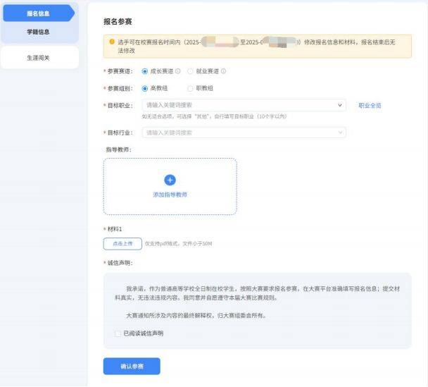 2.填写报名信息时,依次选择参赛的赛道组别,填写本人目标职业、目标行业,上传校赛参赛材料,阅读并勾选“诚信声明”,点击“确认参赛”按钮即可完成报名。