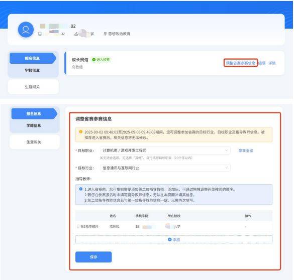 1.当学校通知相关选手可调整省赛参赛信息且校级管理员开放选手调整省赛参赛信息功能后,选手可在“个人中心-报名信息”页面点击“调整省赛参赛信息”按钮进入对应编辑页面,按要求添加“指导教师”,根据需要可拖动调换 1-2 指导教师顺序,对“目标职业”、“目标行业”信息进行调整,完成后点击“保存”按钮即可。
