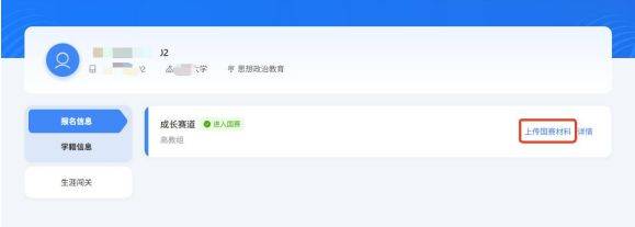 2.若选手成功晋级到国赛,则个人中心-报名信息页面会显示“进入国赛”状态标签,可点击“上传国赛材料”按钮,进行国赛参赛材料的提交。温馨提示:在国赛材料提交时间内,选手可随时修改材料,时间截止后不可修改。