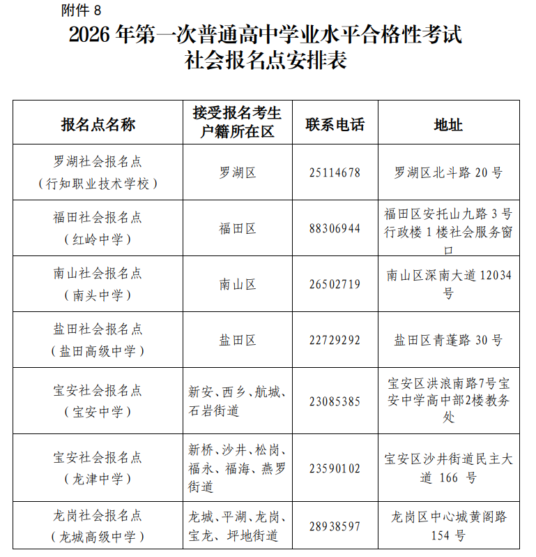 2026年第一次普通高中学业水平合格性考试社会报名点安排表